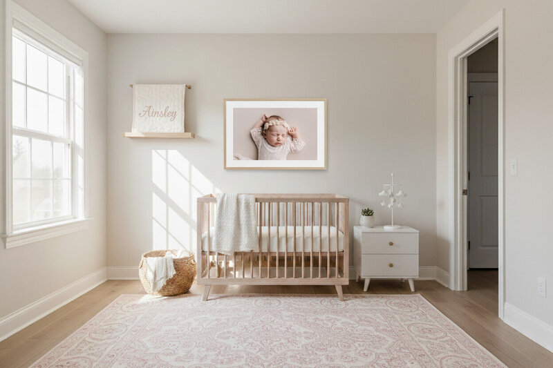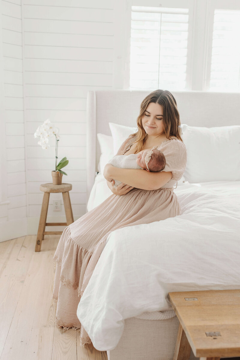 Sessions take place in the comfort of your home or in one of my beautifully styled, natural light studios. Access to newborn and new mama wardrobe is included, and you can add-on professional hair and makeup or a maternity session for a complete experience.